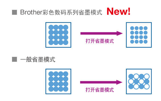 選擇Brother省墨模式可以節(jié)省墨粉消耗。兄弟彩色數(shù)碼系列省墨模式是通過(guò)縮小墨點(diǎn)空間來(lái)完成的,墨點(diǎn)的數(shù)量沒(méi)有改變,即使使用了省墨模式也不會(huì)影響打印質(zhì)量。